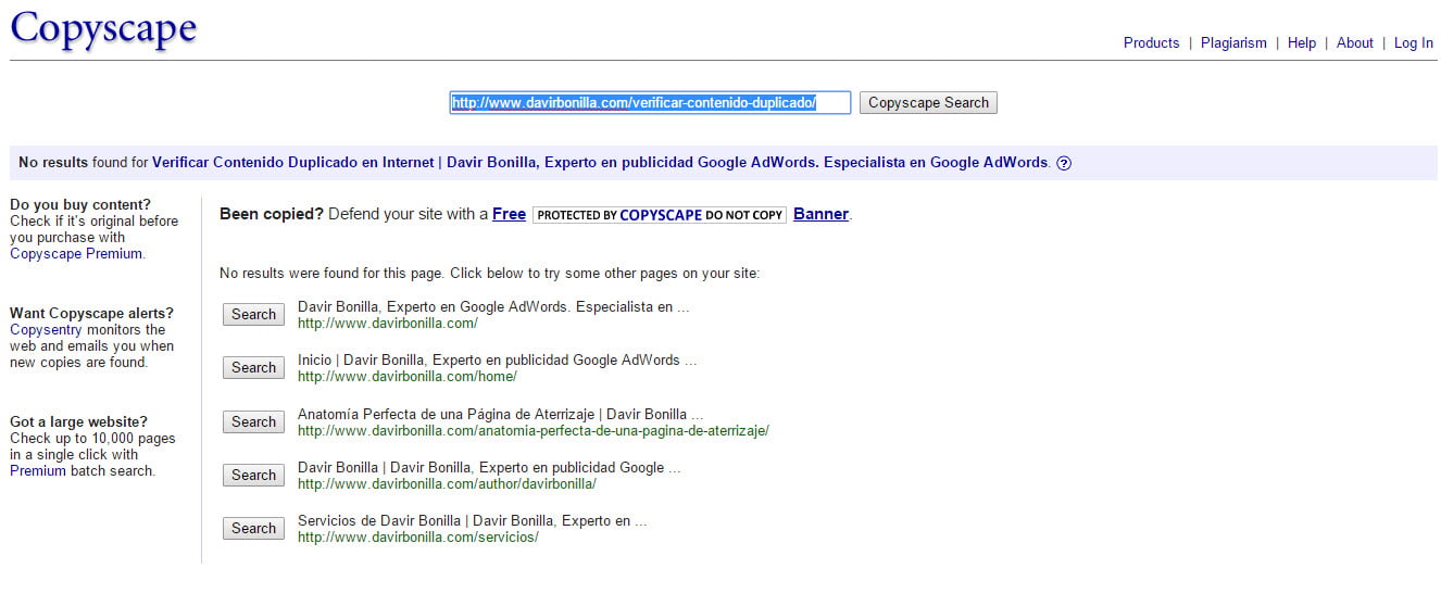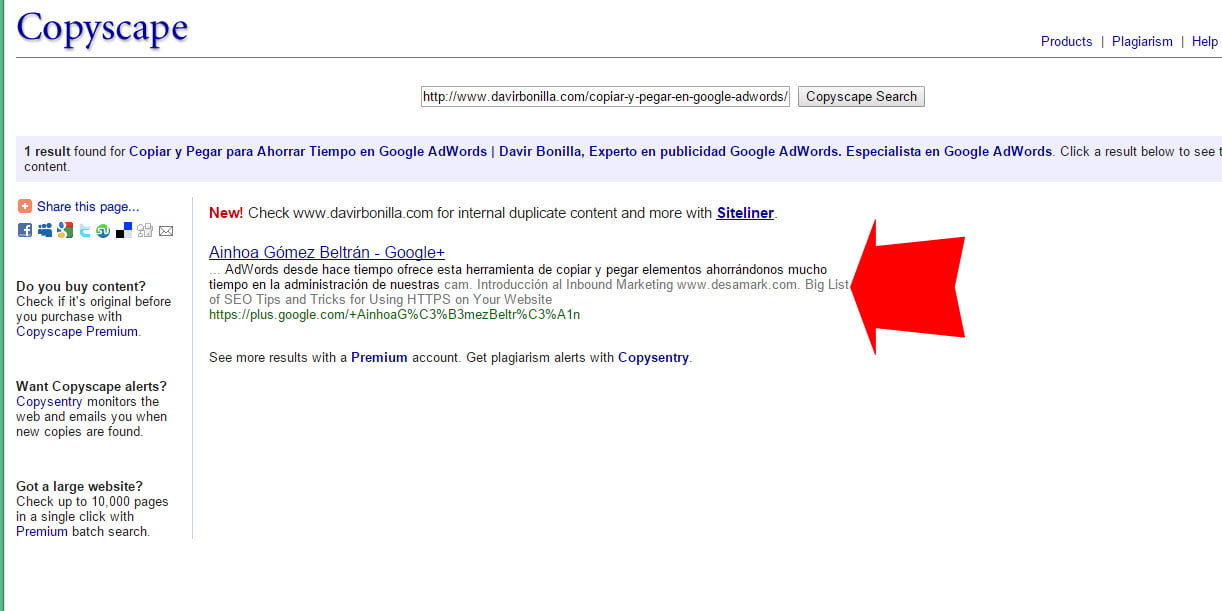 Ahora, si al copiar la URL de tu artículo en el Copyscape te da el siguiente resultado (haz clic en la imagen para ampliar):